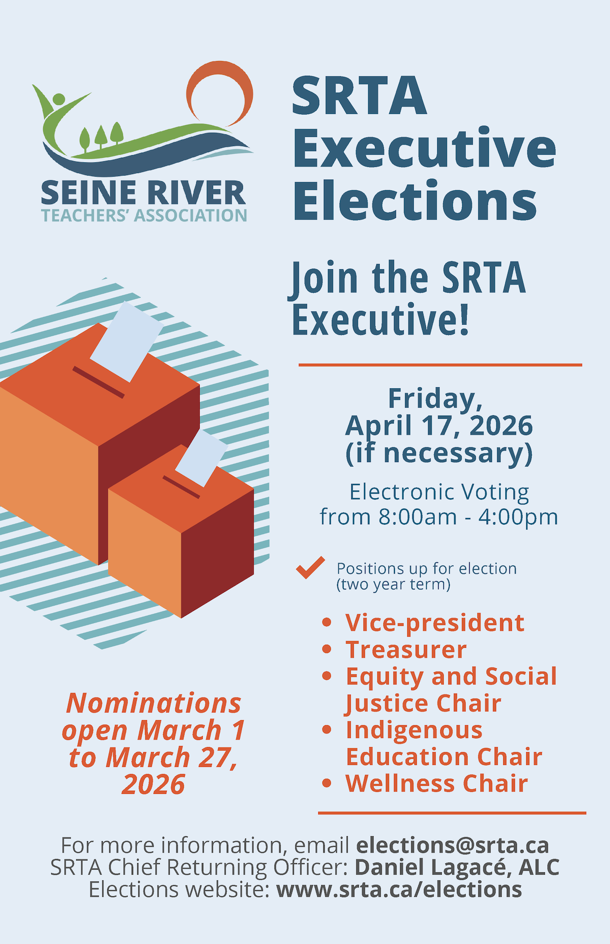 To be nominated as an Executive member of the Seine River Teachers’ Association for the school years 2026-2028, please access the forms on our elections page, fill out Nomination Form linked there, and ensure it is received no later than March 27, 2026.